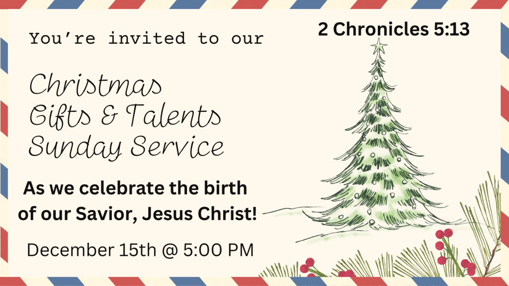 We invite you to join us for a special Christmas Gifts & Talents Service on Sunday December 21 at 5:00PM. This will be an evening of worship and music as we celebrate the birth of our Savior, the Lord Jesus Christ.